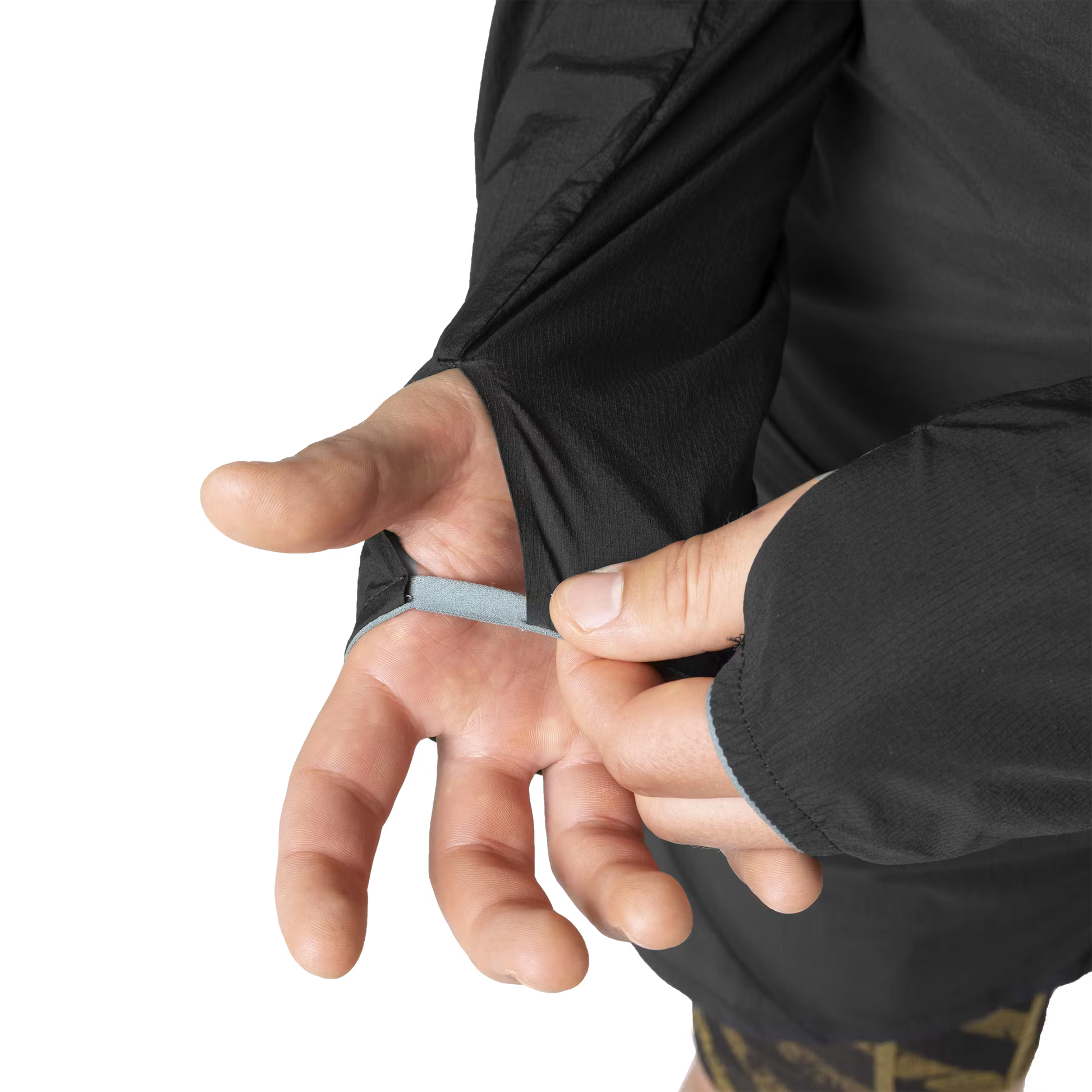 - Kapuze: eng anliegend, elastisch eingefasst